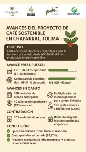 El contrato IC 2181-2024 – FCP – DEBISAMCO, orientado al mejoramiento y optimización de secado y transformación de café en producción limpia, muestra importantes avances en beneficio de los pequeños productores en Chaparral, Tolima.